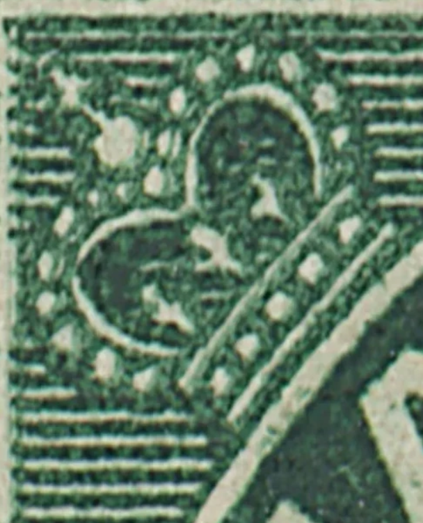 The impression of the crown on the right is 'normal', except for the line of plate damage extending from the lower left. This line has been shown to be constant and, like re-entries and retouches, will be found on only one position of a single plate. Remember that there are dozens to hundreds of plates for most denominations of the Admiral issue.