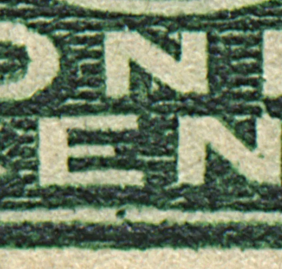 1¢ Green Coil Dot Under E
