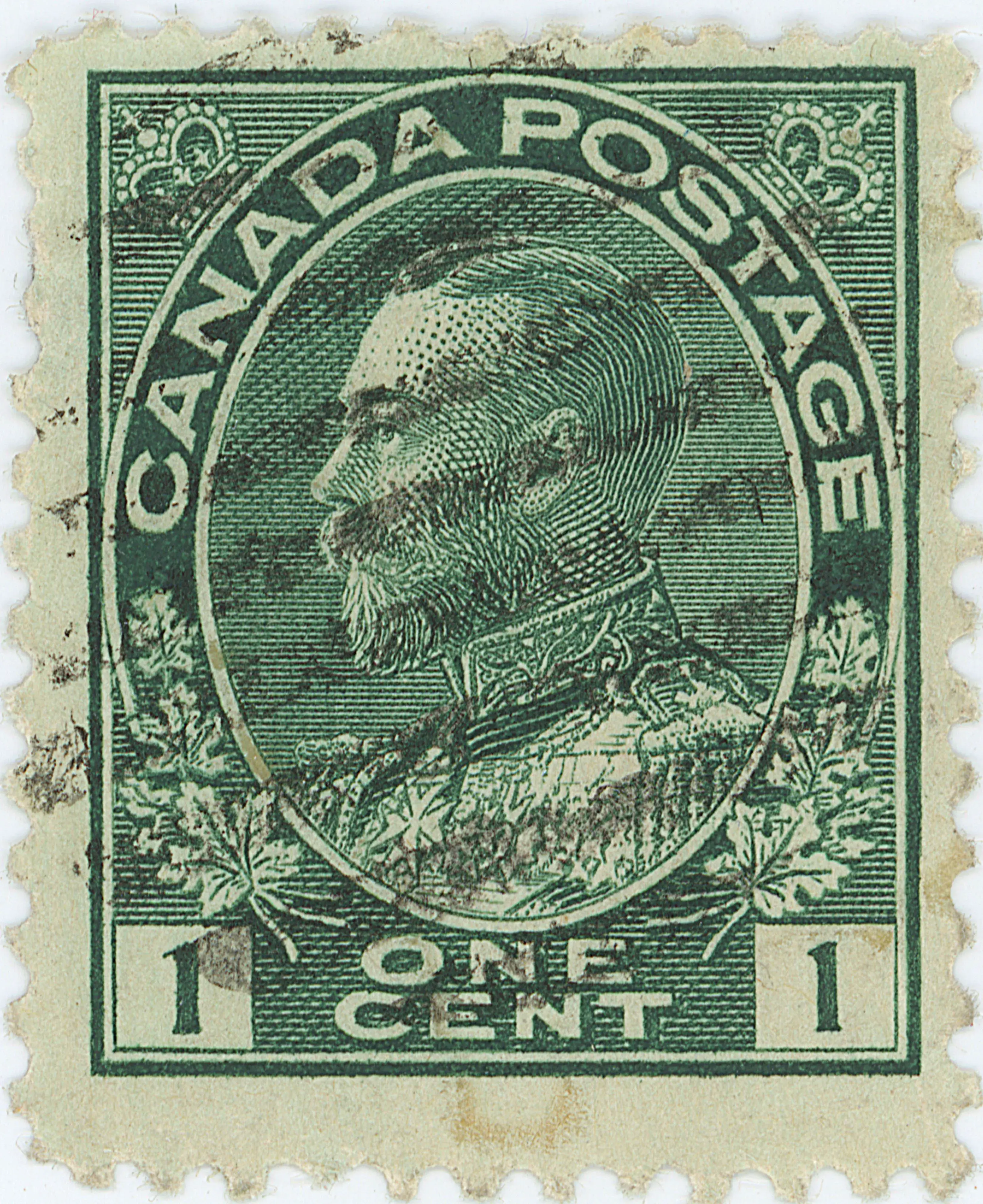 Unusual doubling in the leaves, more so in the right. Doubling also found in several letters of Canada Postage and in the inner oval, most notably across from left leaf 4.