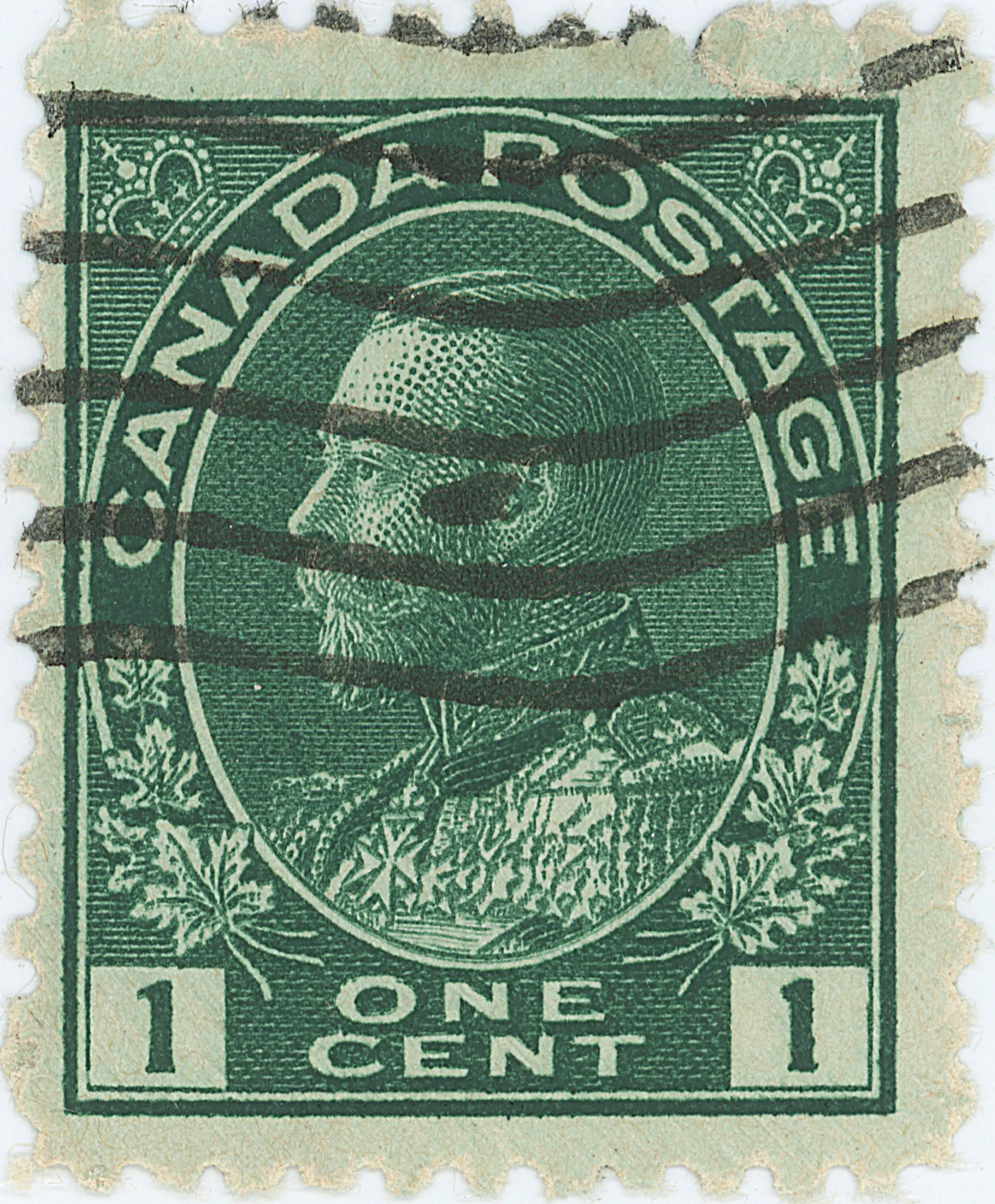 Doubling of both '1's, the bottom of the portrait oval, the top line of the left numeral box, in 'NE' of One and the veins in both left and right leaf 1.