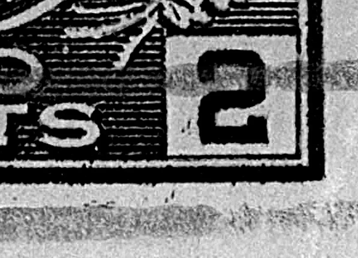 Doubling of both horizontal lines of the left numeral box. Short parallel lines or dashes in the bottom margin below the 'S' of Cents and in and below the right numeral box.