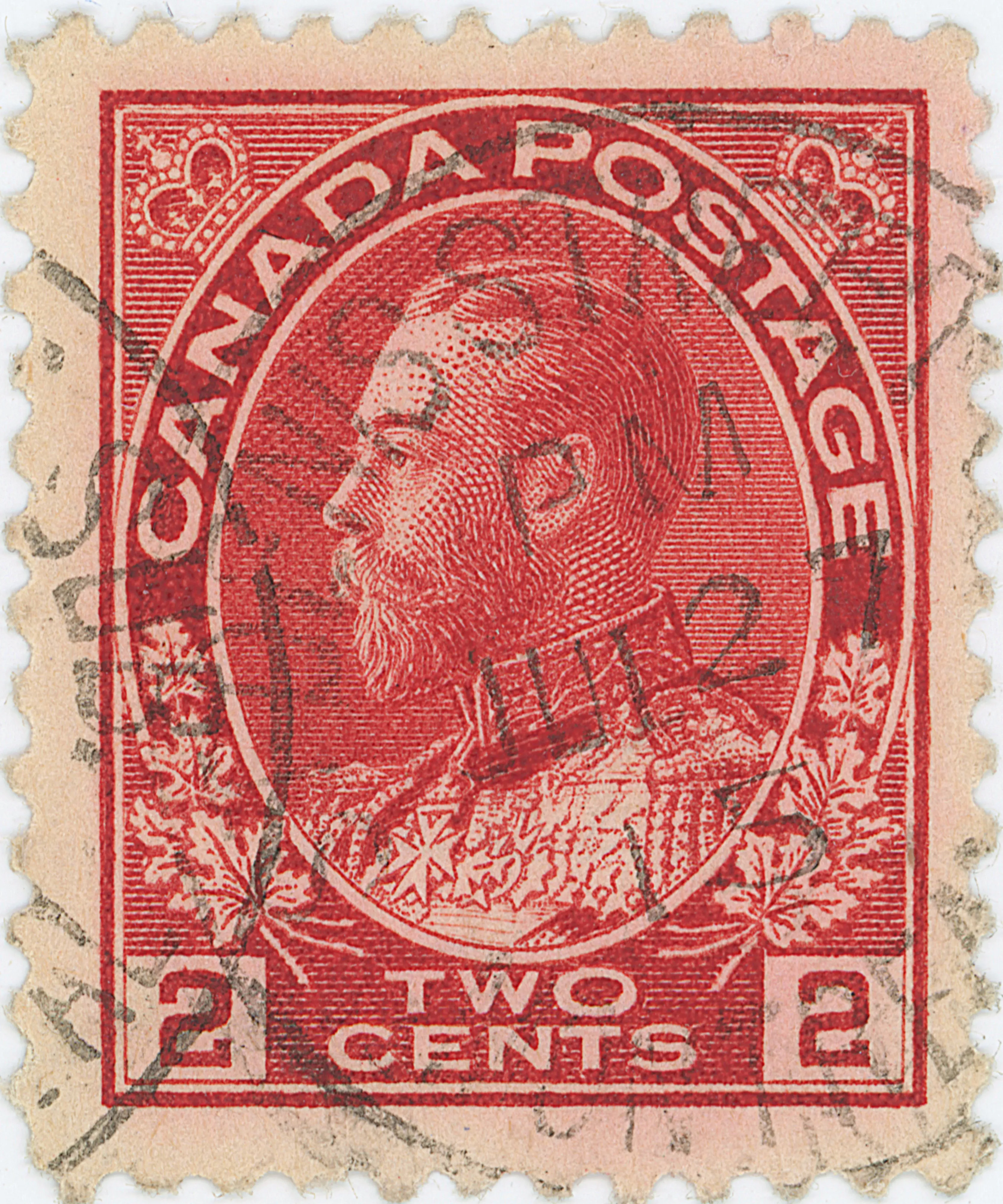 Doubling inside most of the top frame. There are minor indications of doubling in both crowns and at the top of the 3rd 'A' of Canada. There is doubling of the right frame opposite the 'GE' of Postage.