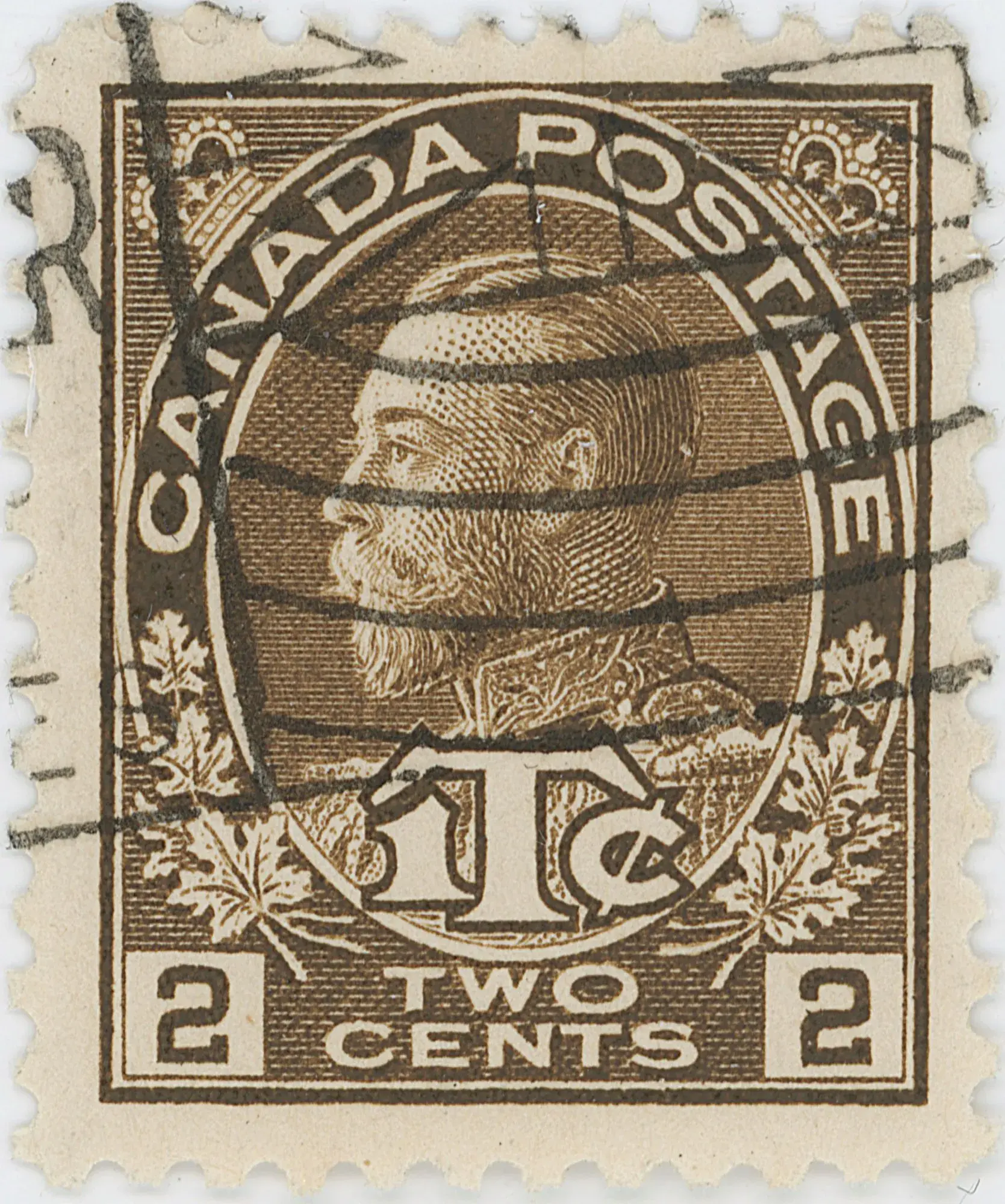 A strong vertical slash from near the bottom of the upper left spandrel, through the outer oval and just touching the 'C' of Canada.