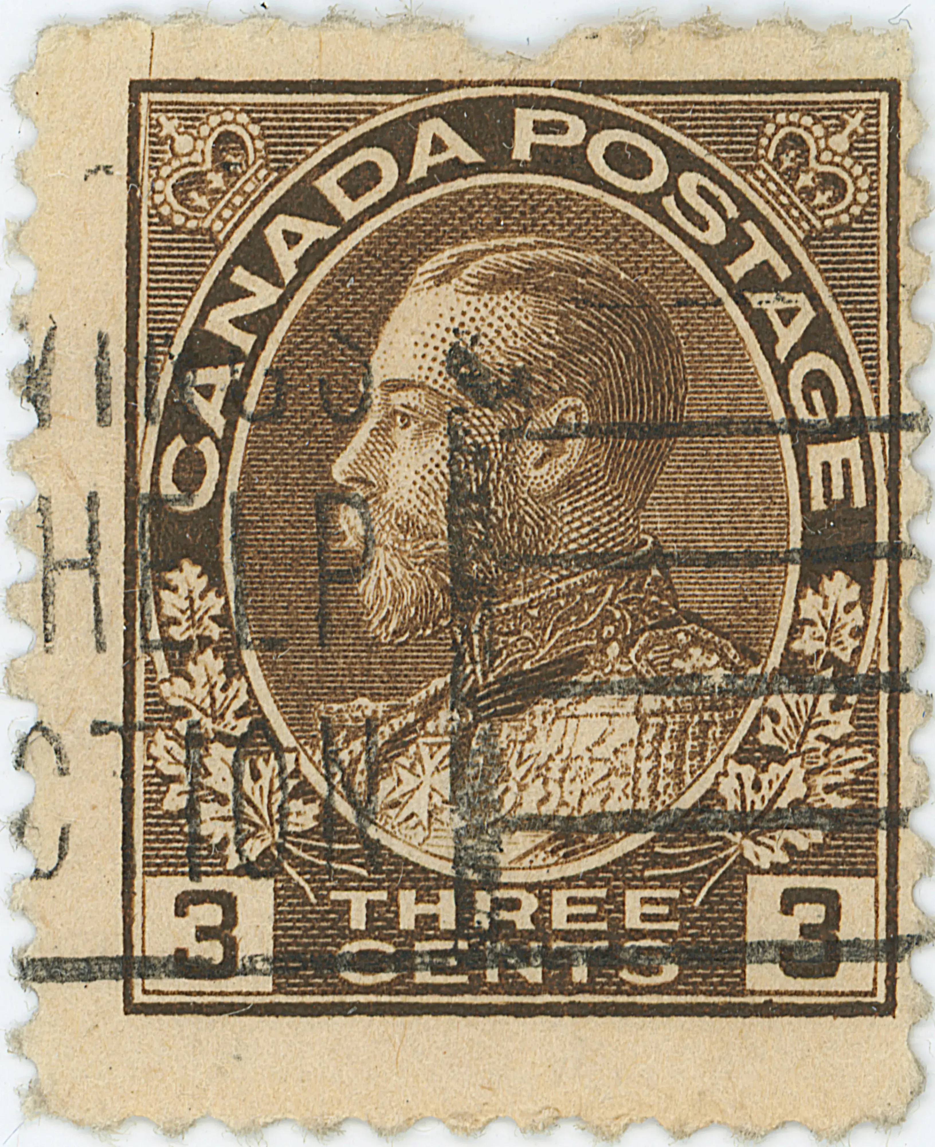 A strong, slightly diagonal line which starts inside the left frame near the crown and extends well into the top margin.
