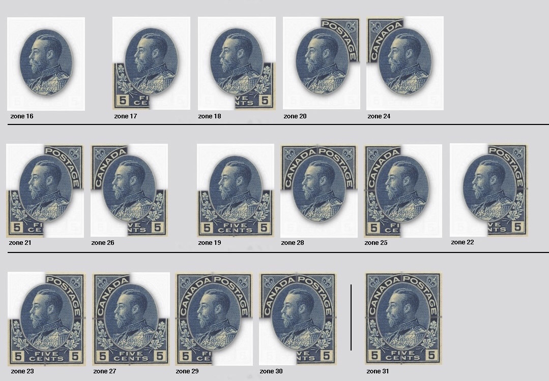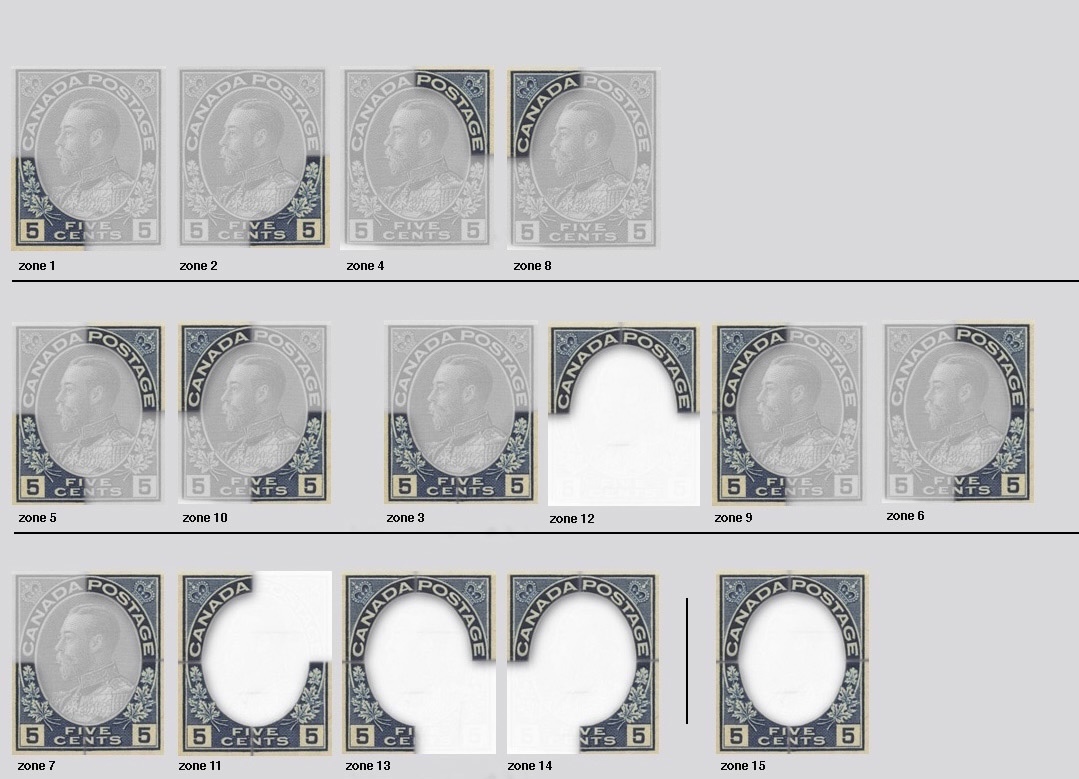 The “Zone” number shows where on the stamp a variety appears. If a variety overlaps two or more areas, the numbers for those areas are added together to create its Zone. Click any Zone number below to see how the system works. For a variety to be part of a Zone, it must fall entirely within that coloured area.